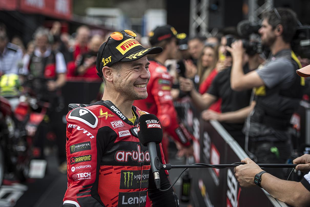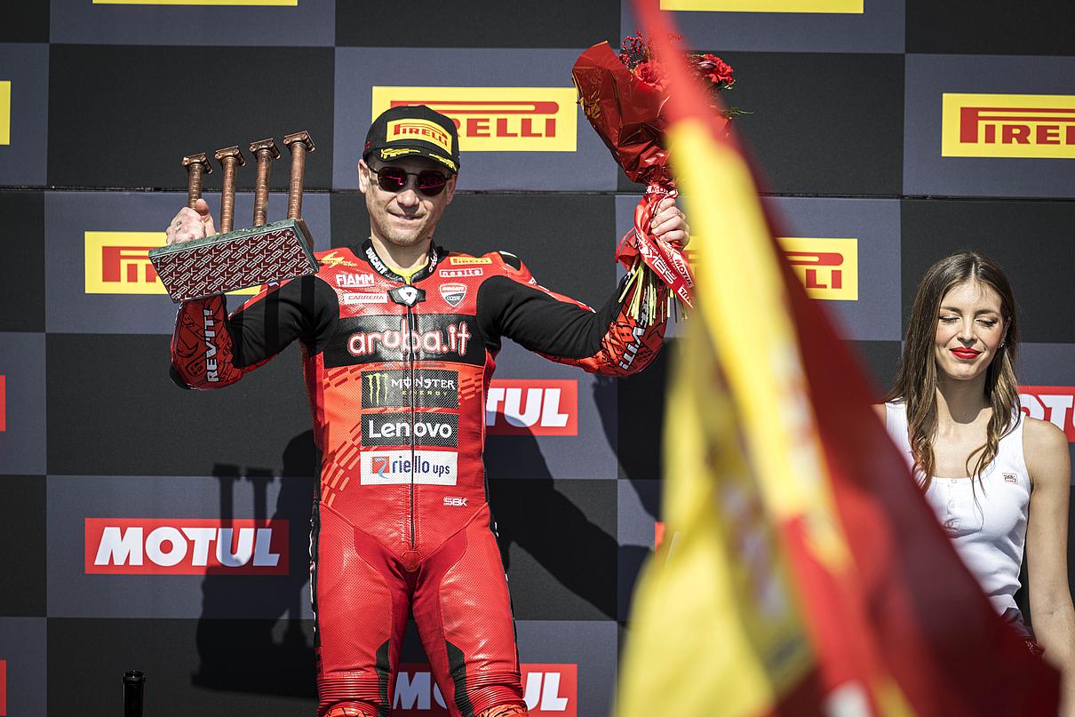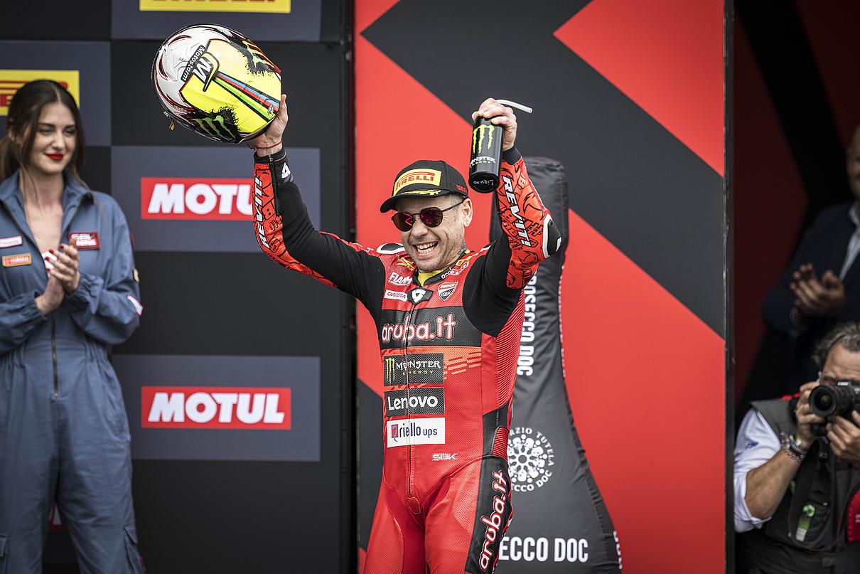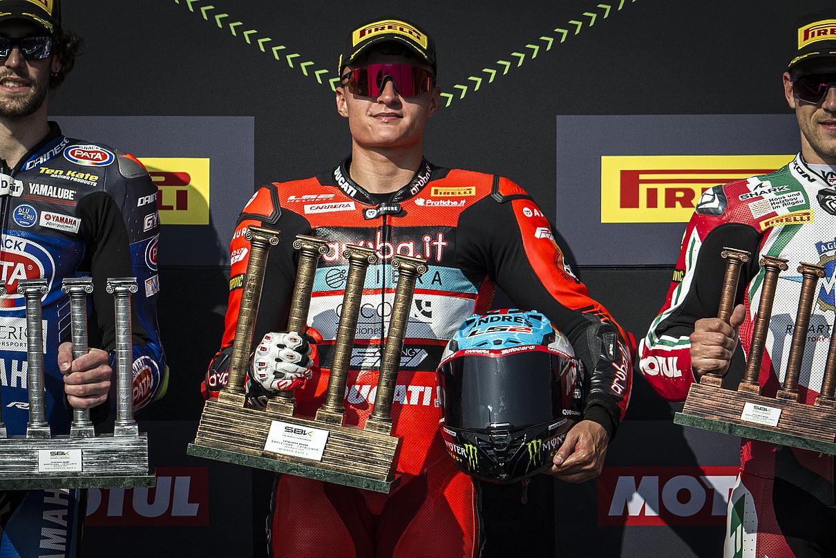 SAMSTAG  "Es war sehr schwierig, von Platz 14 aus wieder in die Spitzengruppe zu kommen. Und ehrlich gesagt verstehe ich die Gründe für die Strafe nicht, denn im Qualifying hat meine niedrige Geschwindigkeit keinen anderen Fahrer in Schwierigkeiten gebracht. Ich bin glücklich über diesen Podestplatz, aber ich habe noch nicht das beste Gefühl für meine Panigale. Wir müssen weiterarbeiten und uns verbessern."