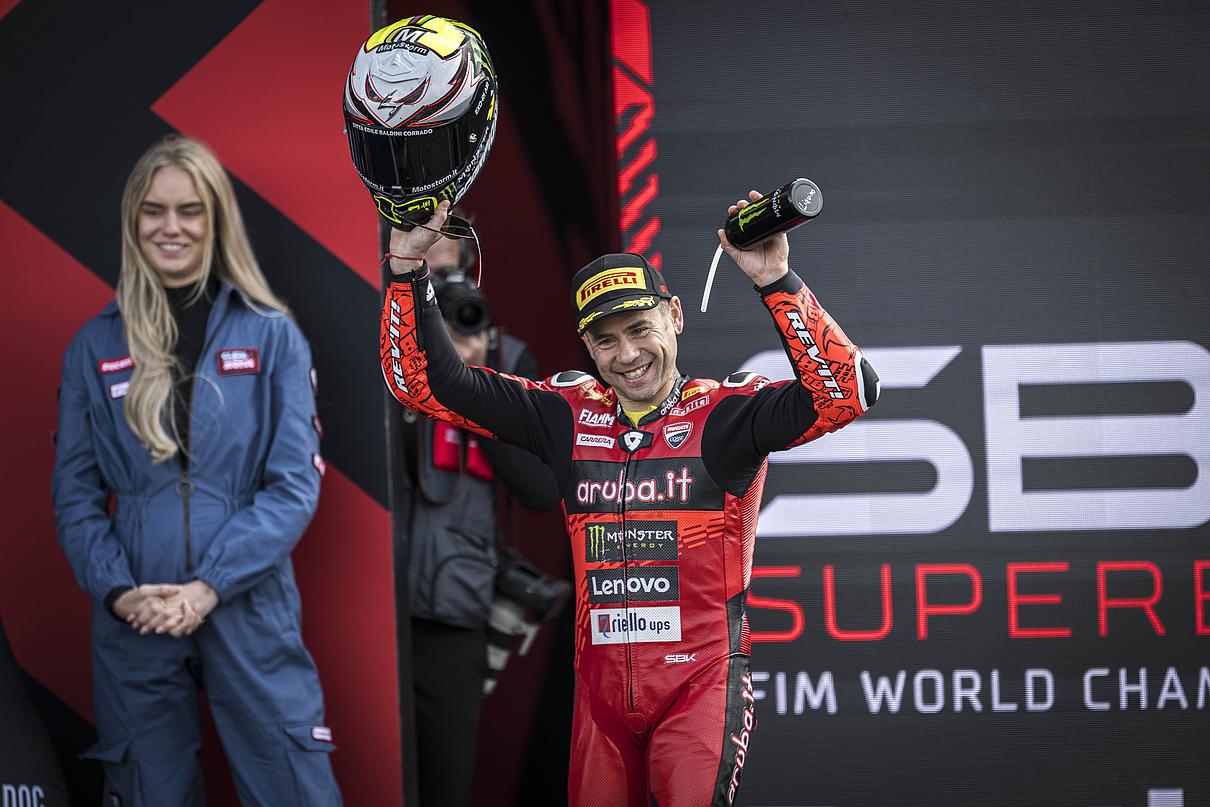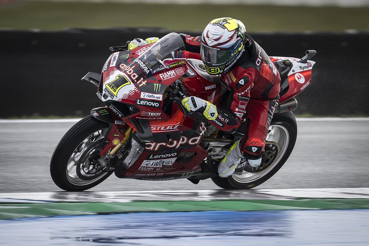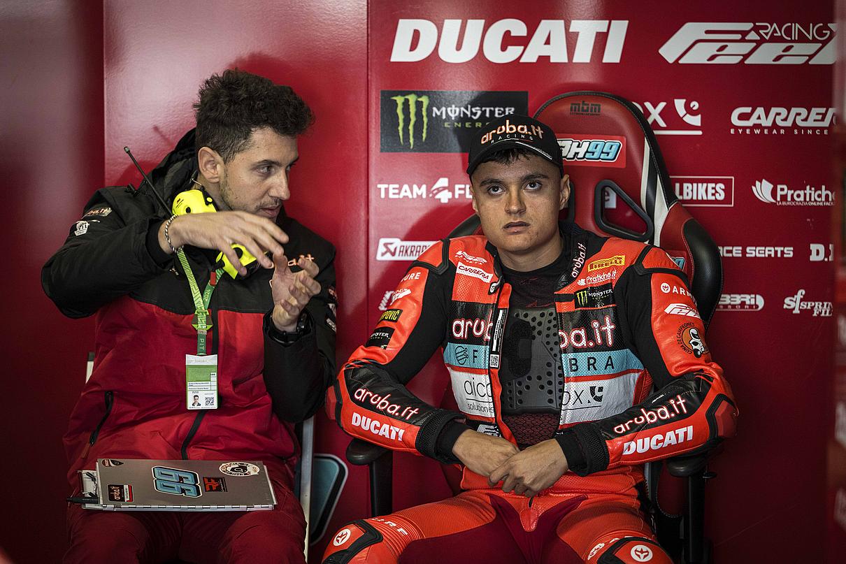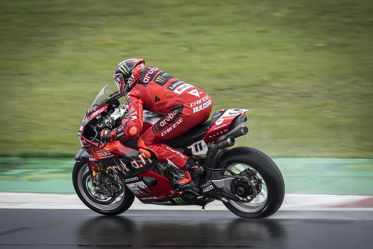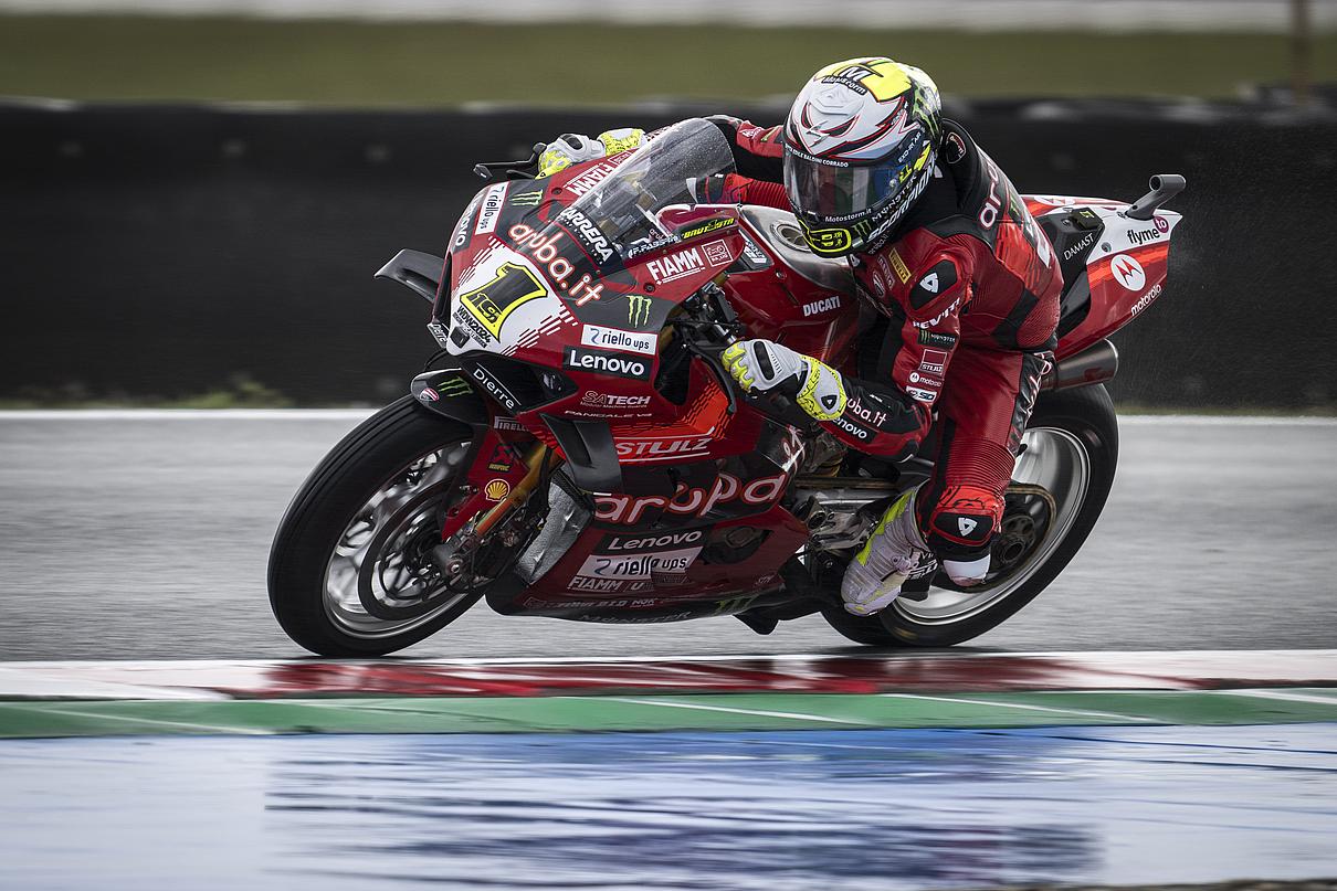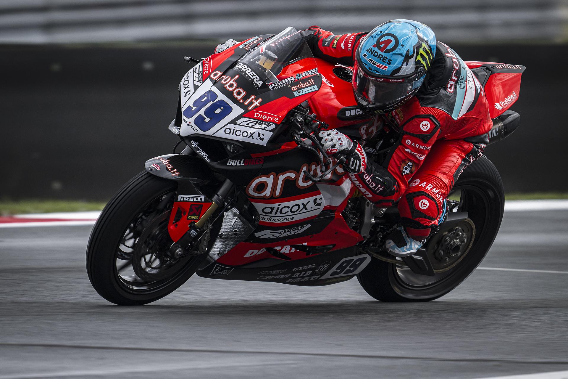 Der Samstag brachte mit unvorhersehbarem Wetter weitere Herausforderungen. Bautista kämpfte im Rennen 1 um den Sieg, wurde jedoch durch eine rote Flagge gestoppt. Spinelli (Barni – Ducati Ersatzfahrer für Petrucci) war der einzige auf Regenreifen und rettet seinen Vorsprung bis zum Abbruch glücklich zum Sieg. Bulega konnte nicht mit der Spitzengruppe mithalten und belegte den 11. Platz.