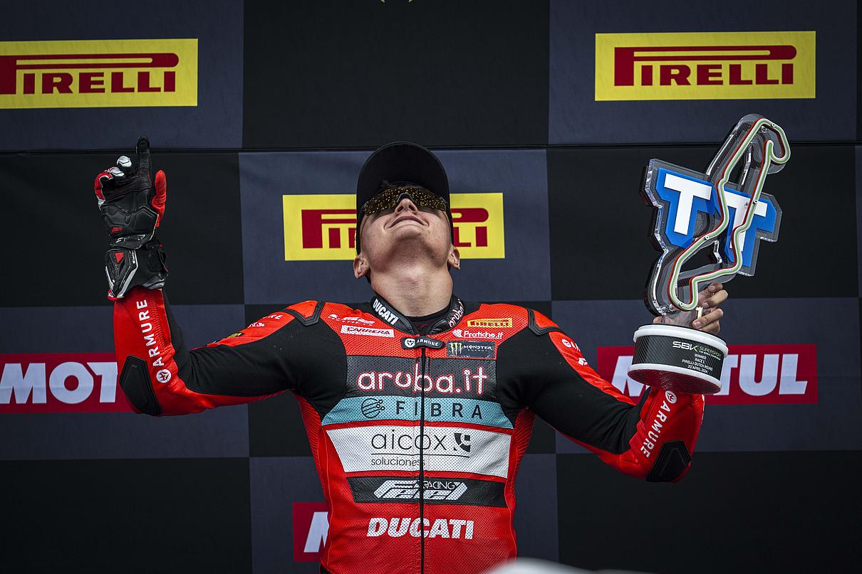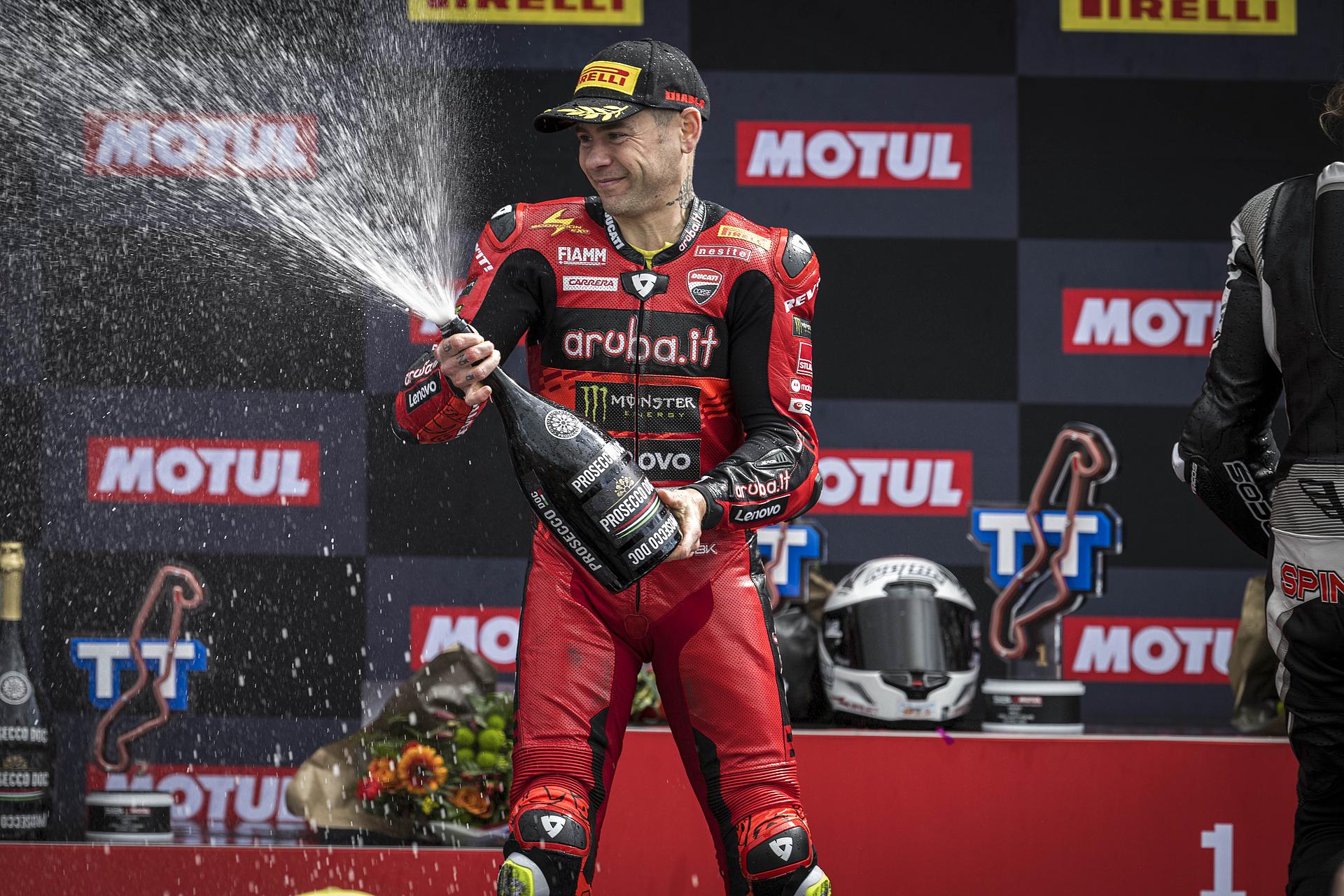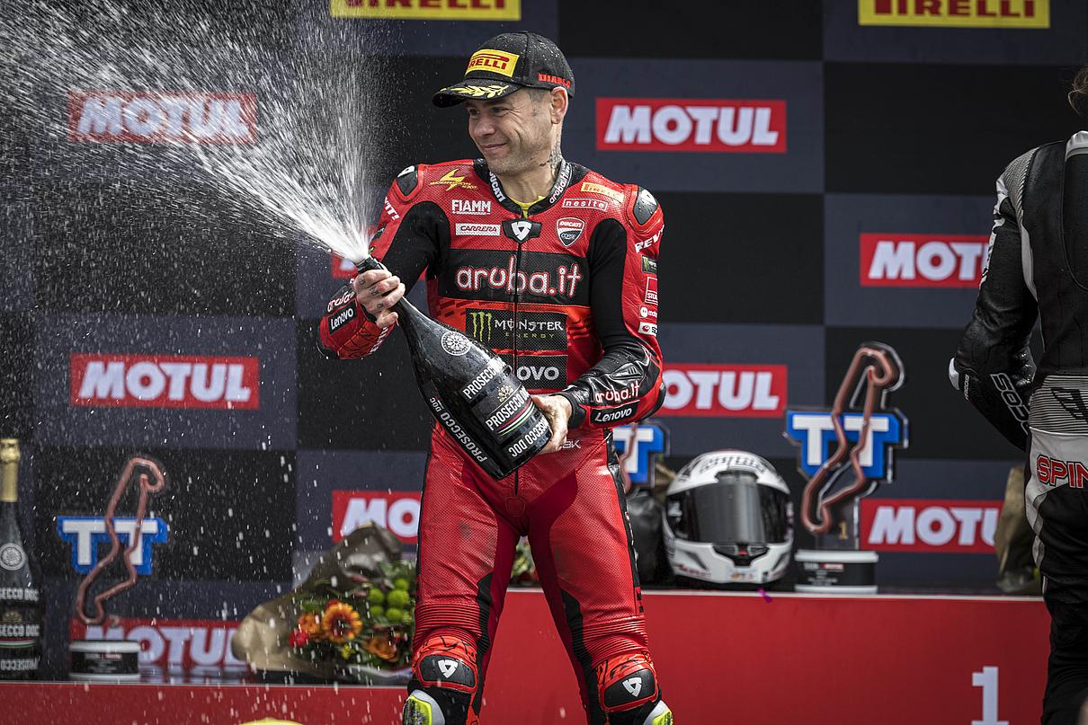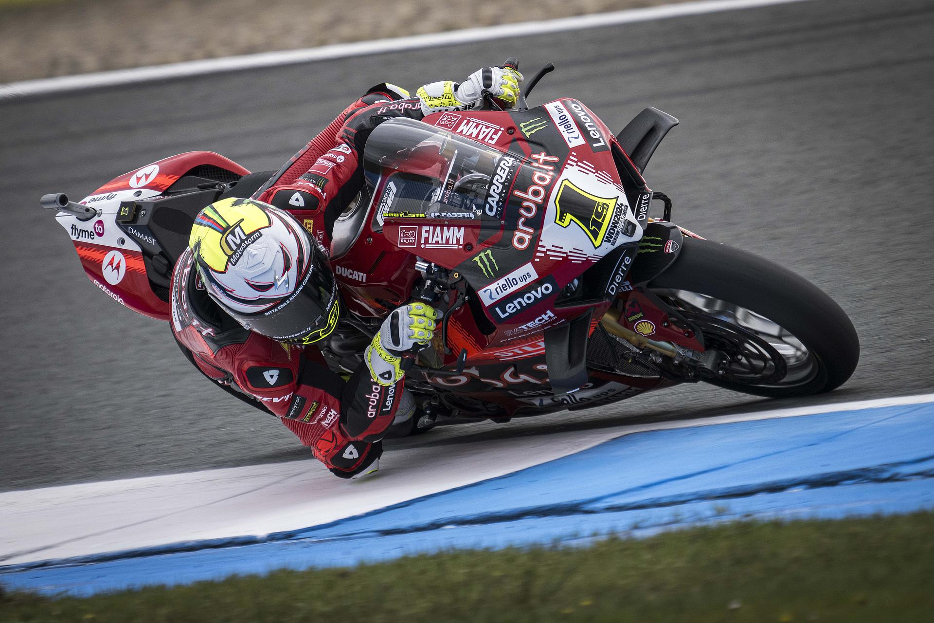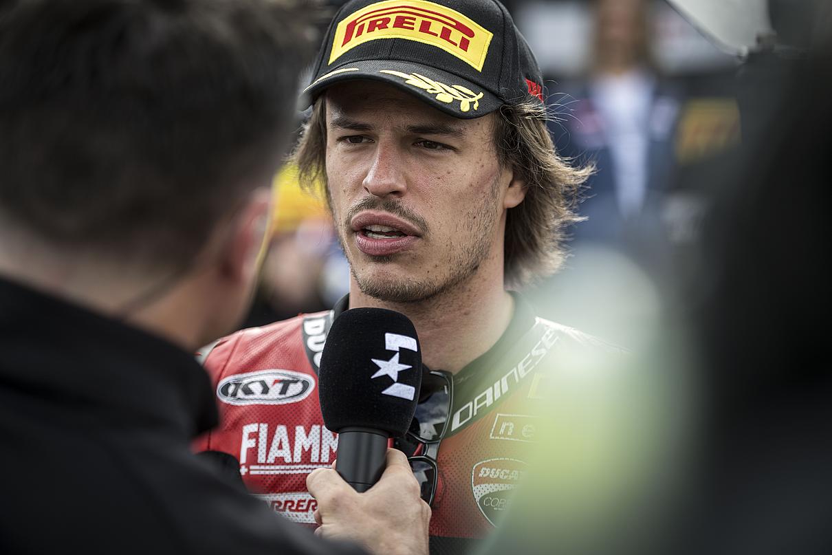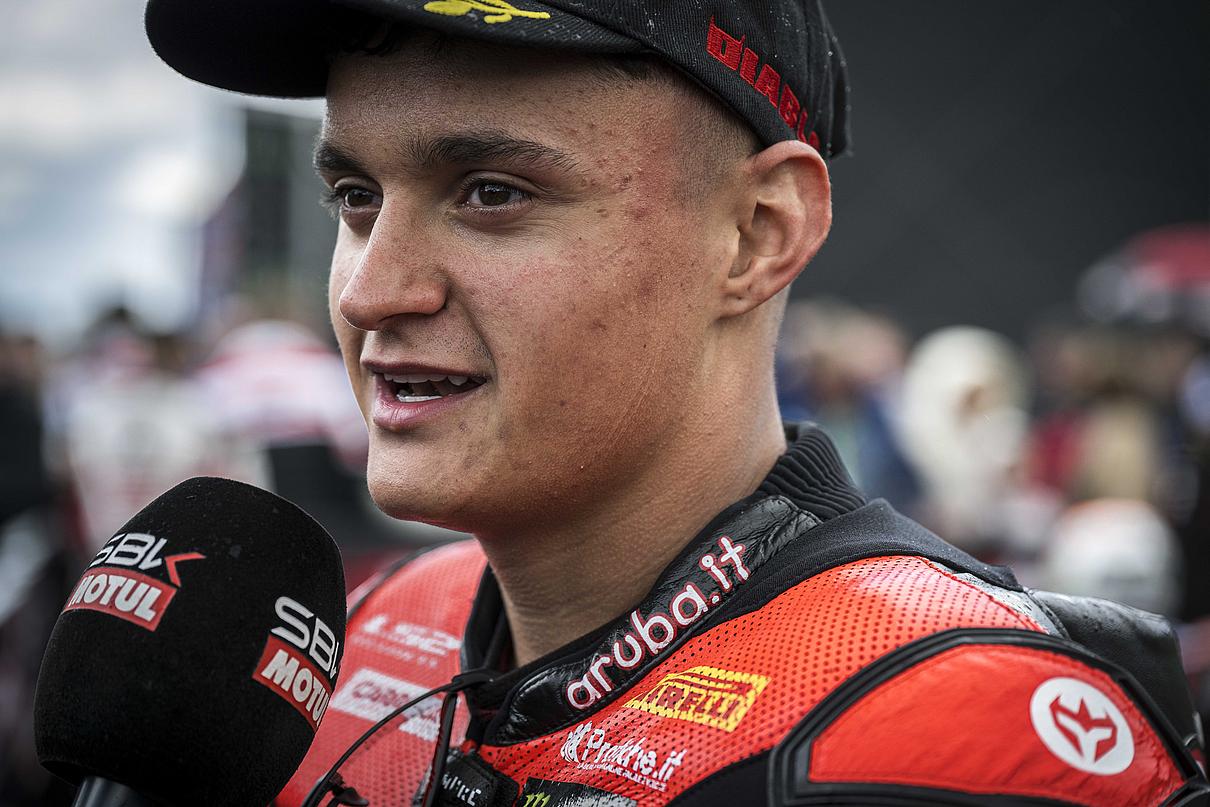 Der Samstag brachte mit unvorhersehbarem Wetter weitere Herausforderungen. Bautista kämpfte im Rennen 1 um den Sieg, wurde jedoch durch eine rote Flagge gestoppt. Spinelli (Barni – Ducati Ersatzfahrer für Petrucci) war der einzige auf Regenreifen und rettet seinen Vorsprung bis zum Abbruch glücklich zum Sieg. Bulega konnte nicht mit der Spitzengruppe mithalten und belegte den 11. Platz.