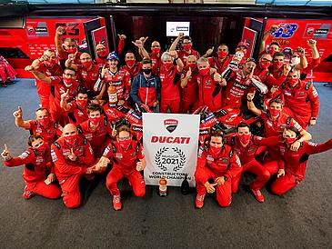 mehrDank eines weiteren sensationellen Sieges von Pecco Bagnaia auf dem Autodromo Internacional do Algarve in Portimão (Portugal) sicherte sich Ducati zum zweiten Mal in Folge die MotoGP Konstrukteurs-Weltmeisterschaft, wiederholt ein Rennen vor dem Ende der Saison 2021.
