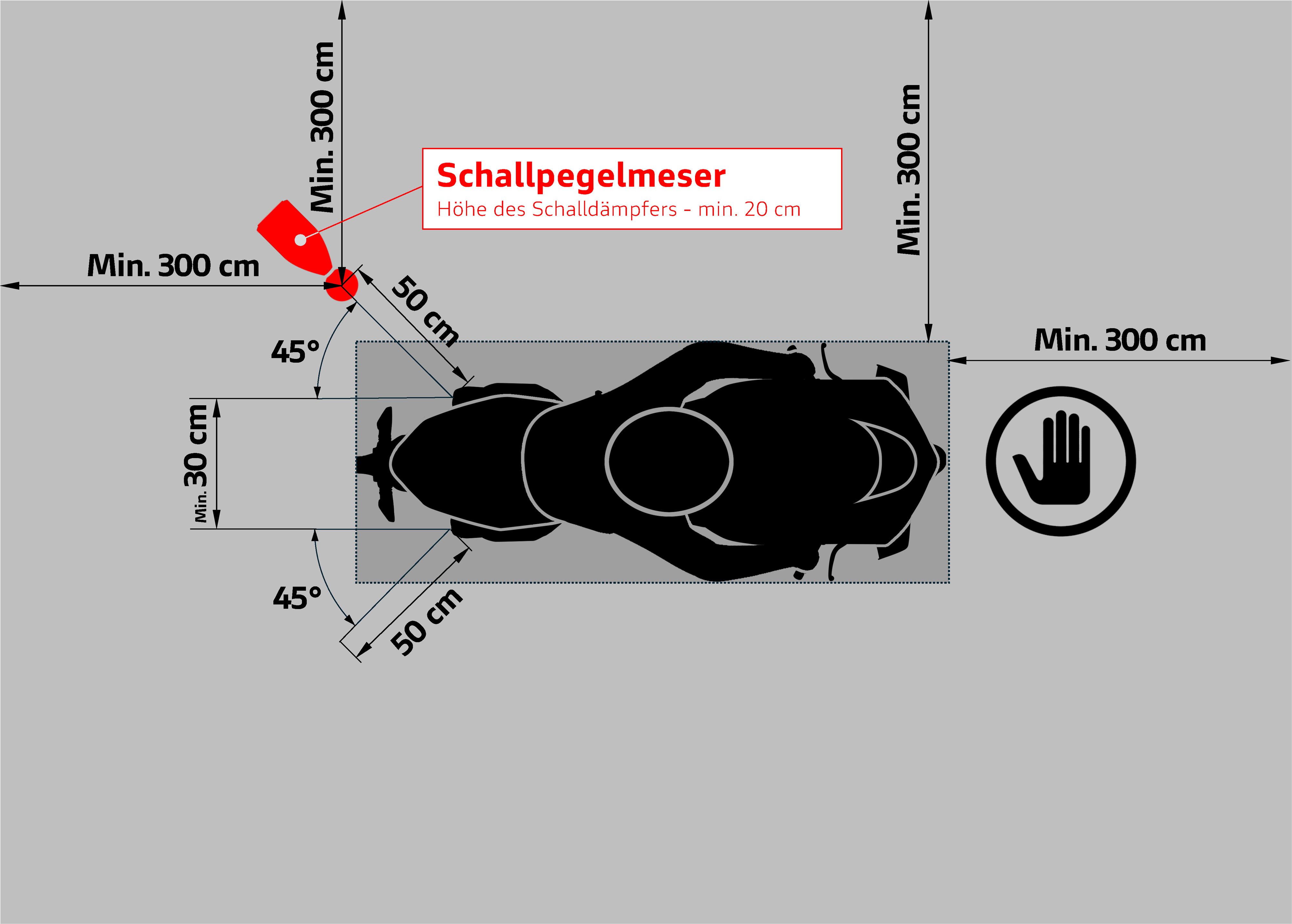 Das Fahrzeug muss auf einer ebenen, festen Fläche stehen, frei von störenden Geräuschquellen. Im Abstand von 3 Metern dürfen keine schallreflektierenden Objekte vorhanden sein. Der Schallpegelmesser wird 50 cm hinter dem Schalldämpfer in einem Winkel von 45° auf eine Höhe von mindestens 20 cm über dem Boden positioniert. Bei mehreren Schalldämpfern, die mehr als 30 cm voneinander entfernt sind, muss für jeden eine separate Messung erfolgen. Die Messung erfolgt in der Regel bei der halben Nenndrehzahl des Motors, Drehzahl und Sollwert ist den Zulassungsdokumenten zu entnehmen. In Österreich gibt es eine Messtoleranz von ± 3 Dezibel.